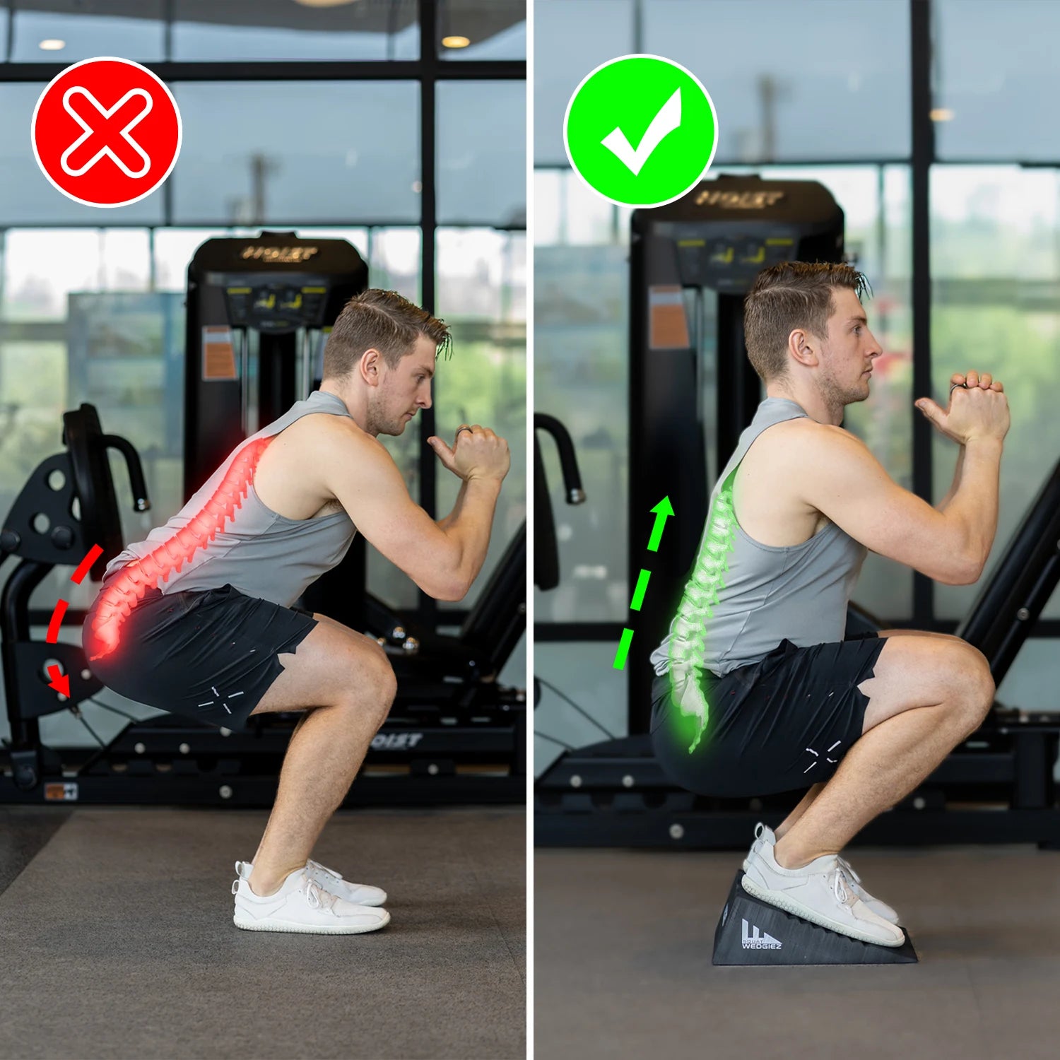 Weight plates may elevate your heel, but they don’t bring your center of mass backward; they put more pressure on your forefoot, which is not the goal. The purpose of a heel elevated squat is to shift your weight backward so that the knees have more space to go forward. Also, you have to stack three five-pound plates to get the same heel elevation as Squat Wedgiez. Weight plates leave gaps between your feet and the ground, decreasing your balance and reducing the sensory information needed for your ankle and foot to work optimally.